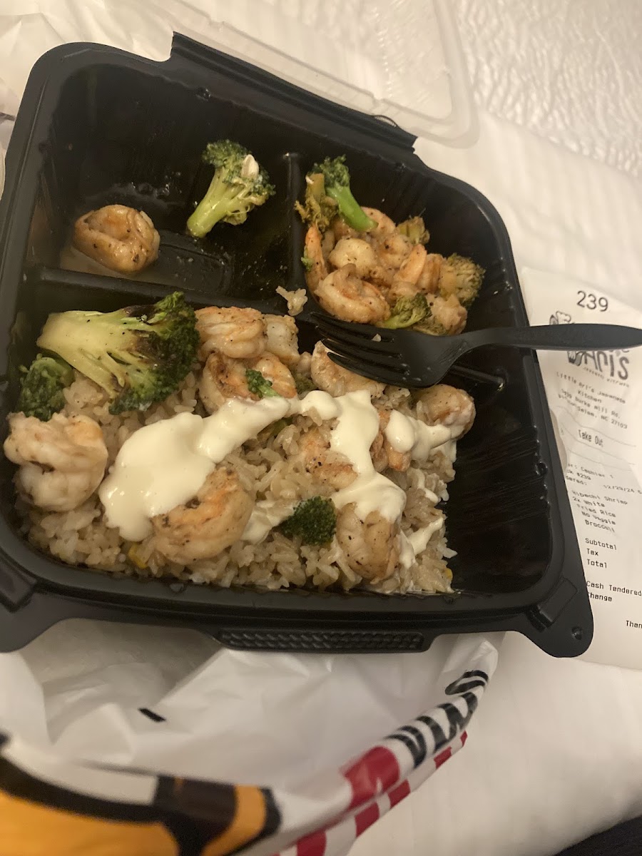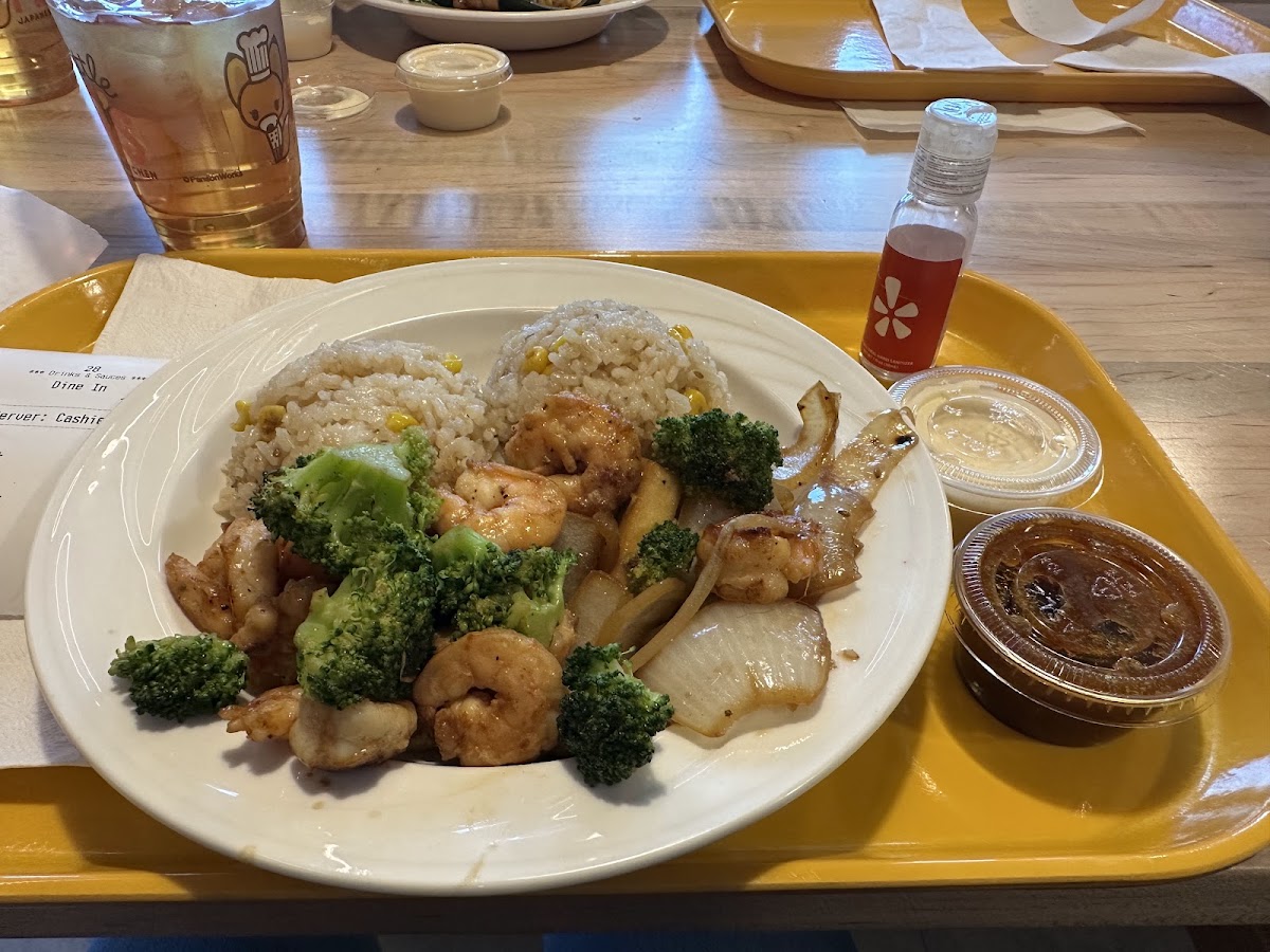 Hibachi Shrimp w/. fried rice & broccli… Was expecting it to have no taste but it was actually pretty good. dining area needs better vibes. Football was on & nobody was watching. The cashier lady was very nice. The one with the long hair (blk).