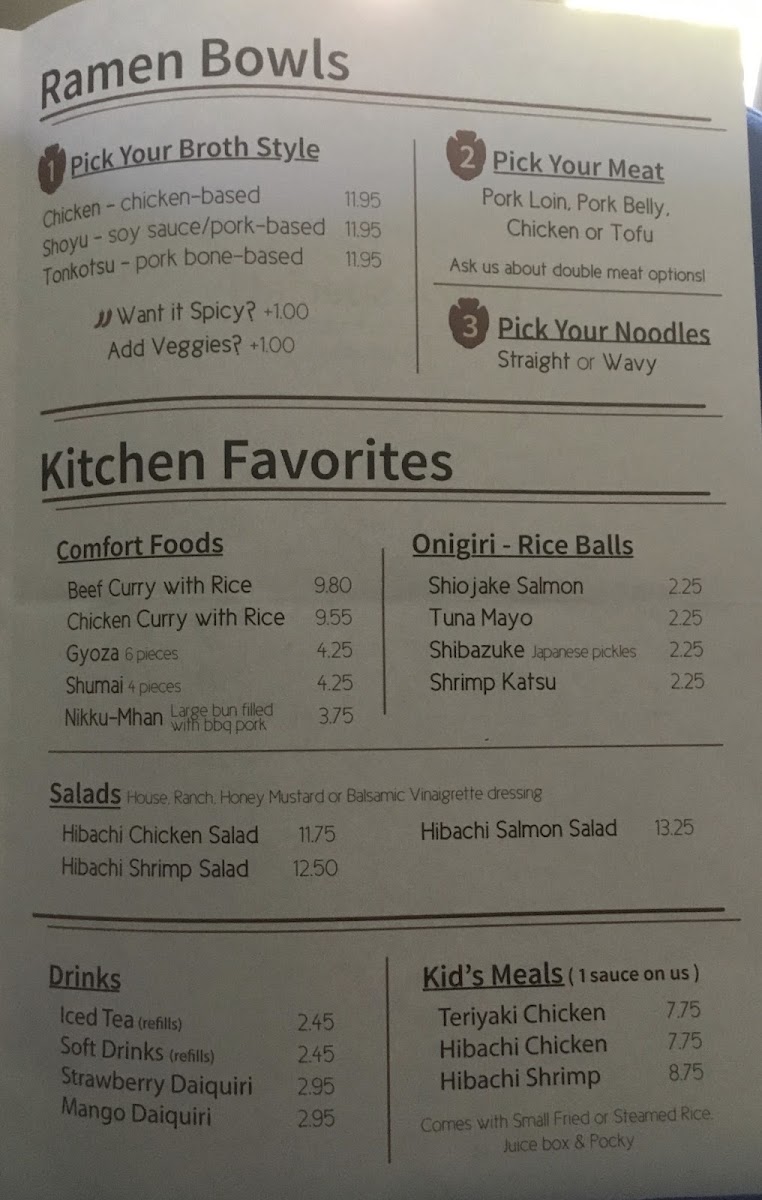 Guests often come here to enjoy warm and filling meals such as spicy ramen or the popular hibachi shrimp paired with fried rice and vegetables. The menu also includes lighter bites like onigiri rice balls, perfect for a quick snack or a shareable appetizer. A modest range of drinks, including iced tea and refreshing fruit daiquiris, complements the food without overwhelming the easygoing vibe.